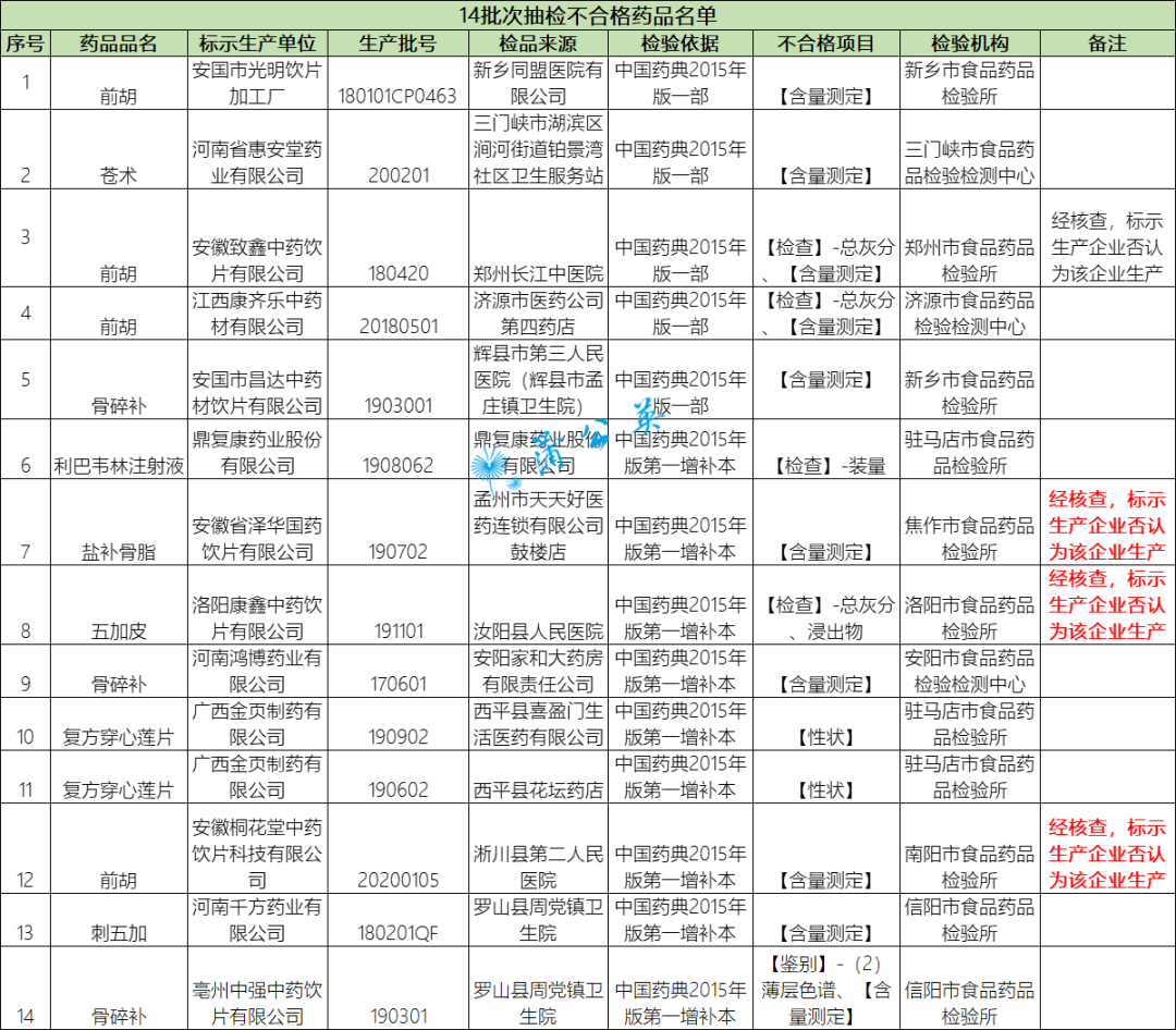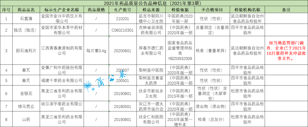 涉及制剂:利巴韦林注射液、复方穿心莲片、胆石通利片涉及饮片:前胡、苍术、骨碎补、盐补骨脂、五加皮、刺五加 、石菖蒲、独活、秦艽、金银花、绵马贯众、山药 特殊说明: 江西青春康源制药有限公司生产的胆石通利片(批号:20200601)重量差异不符合规定,经当地监管部门调查,企业已于2021年10月取得补充申请批准文件; 安徽省泽华国药饮片有限公司生产的盐补骨脂经核查,标示生产企业否认为该企业生产; 洛阳康鑫中药饮片有限公司生产的五加皮经核查,标示生产企业否认为该企业生产; 安徽桐花堂中药饮片科技有限公司生产的前胡经核查,标示生产企业否认为该企业生产;