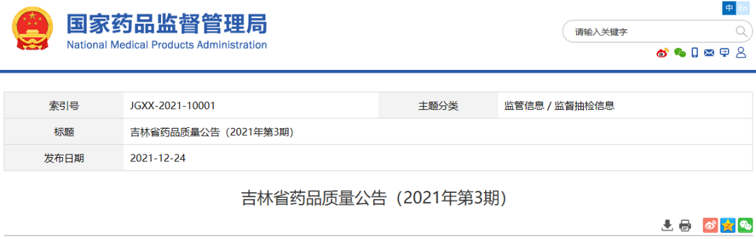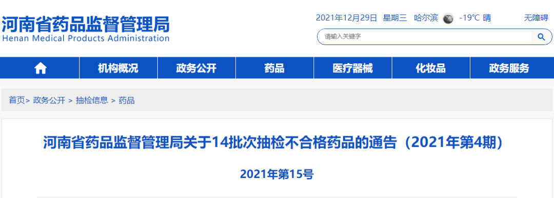 药品监督管理部门已要求相关单位采取风险防控措施,对不合格产品依据相关法律法规进行查处。 特此公告。 吉林省药品监督管理局 2021年12月23日 02 根据年度药品抽检计划,河南省药品监督管理局组织对全省药品生产、经营、使用单位进行了监督抽检。 现将抽检发现的14批次不符合规定药品信息予以通告(见附件)。 附件:药品抽检不符合规定汇总表