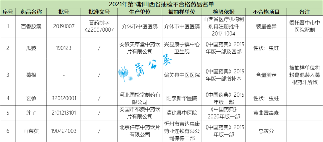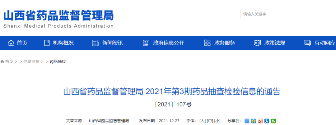 为加强药品质量监管,保障公众用药安全,按照2021年山西省药品抽验计划及日常监督工作需要,我局组织对全省范围内药品生产、经营、使用单位进行了药品质量抽查检验。现将本期药品抽查检验结果通告如下: 一、抽检情况 近期全省共抽查检验858批次药品,经核查确认,检验符合药品标准规定的药品852批次,不符合药品标准规定的药品6批次(详见附件)。 附件:药品抽检不符合规定汇总表