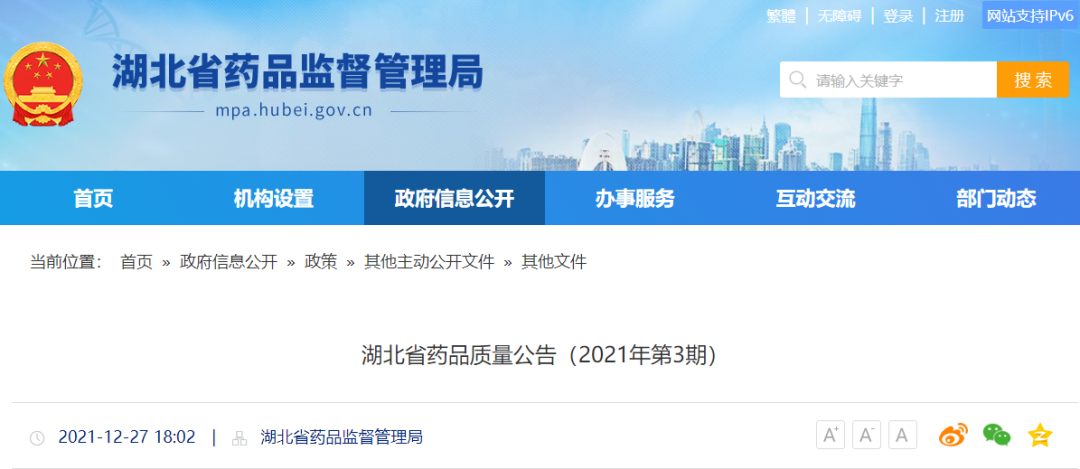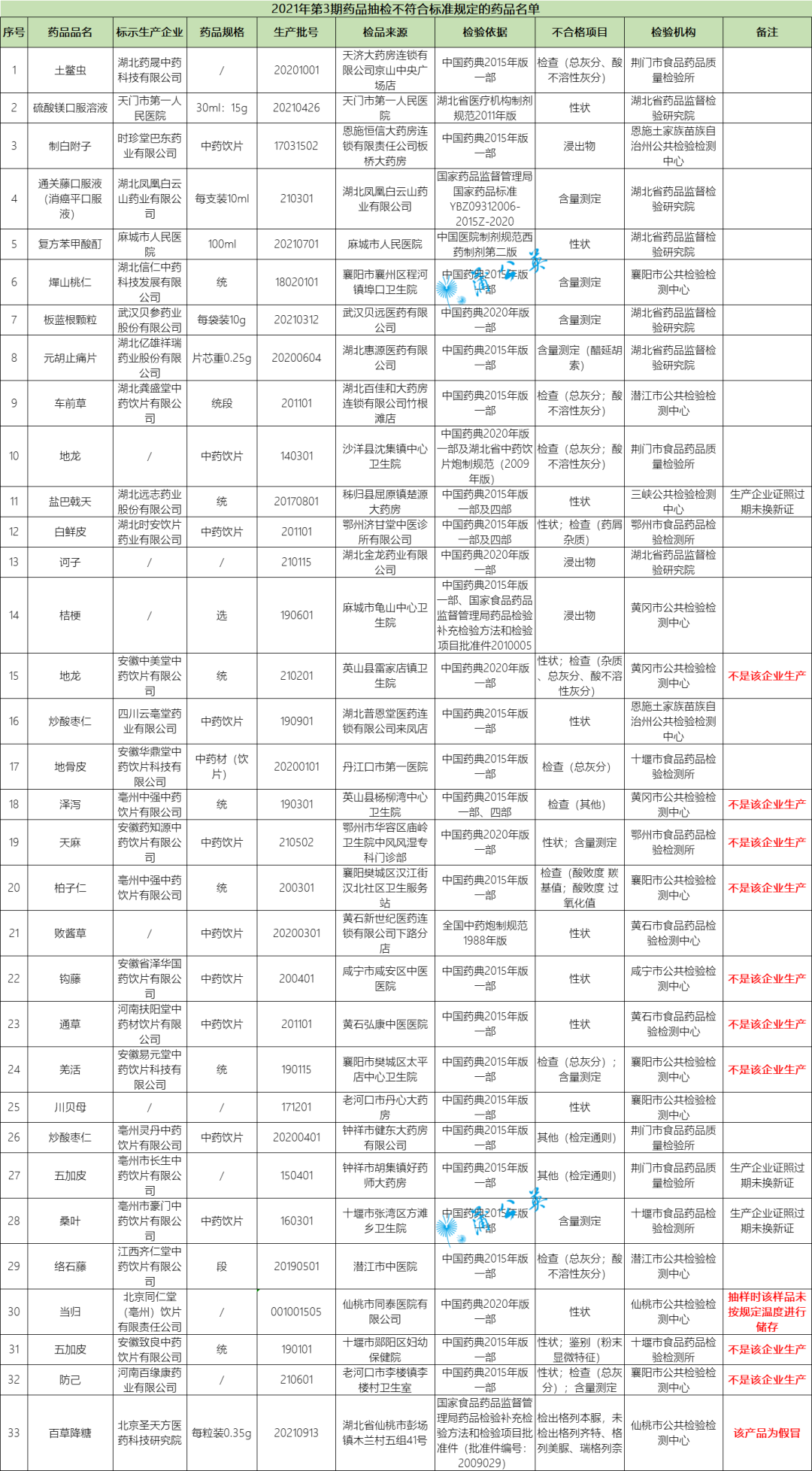 03 为加强药品质量监管,保障公众用药安全,根据湖北省药品监督抽检计划安排,湖北省药品监督管理局组织对全省药品生产、经营和使用单位的药品质量进行了抽查检验。 现将质量抽检中发现的33批次不符合标准规定药品予以公告(详见附件)。 附件:药品抽检不符合规定汇总表