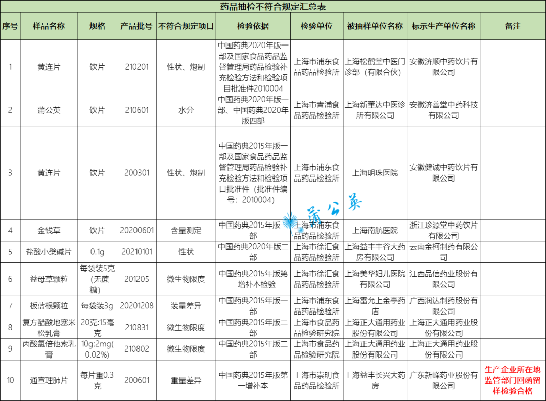 涉及制剂:乳酸依沙吖啶注射液、盐酸小檗碱片、益母草颗粒、板蓝根颗粒、复方醋酸地塞米松乳膏、丙酸氯倍他索乳膏、通宣理肺片;涉及饮片:独活、路路通、前胡、黄连片、蒲公英、金钱草、瓜蒌、葛根、玄参 、莲子、山茱萸等;特殊说明:广东新峰药业股份有限公司生产的通宣理肺片 ,生产企业所在地监管部门回函留样检验合格