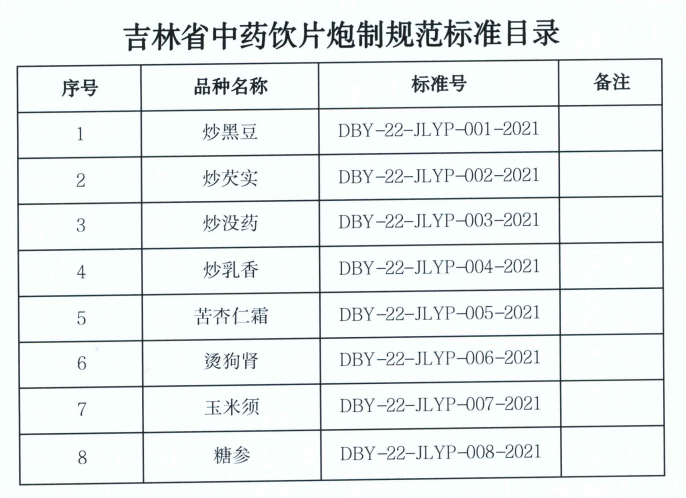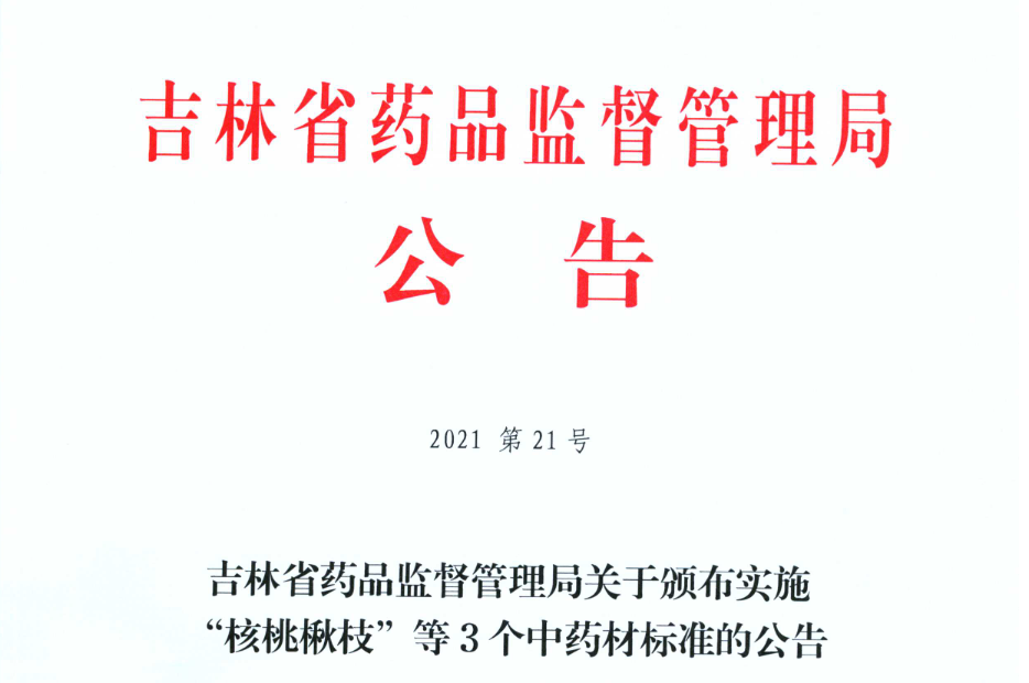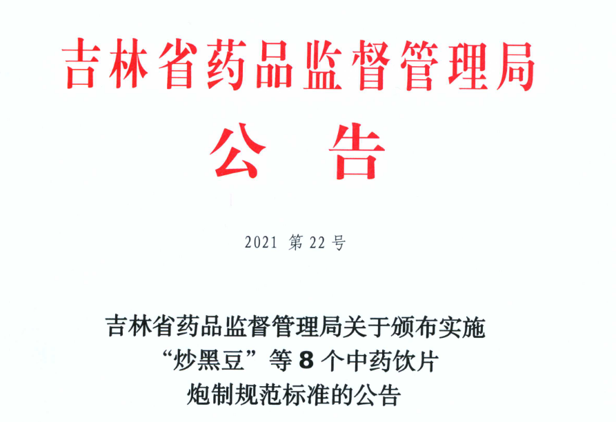 2021年12月31日,吉林省药监局发布了3个中药材标准及8个中药饮片炮制规范的公告,自2022年02月01日实施。