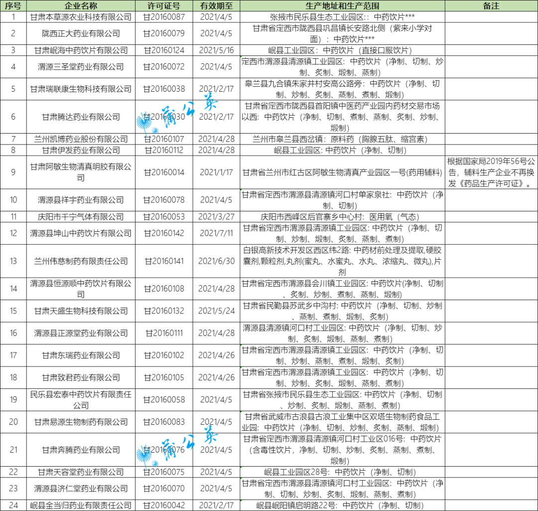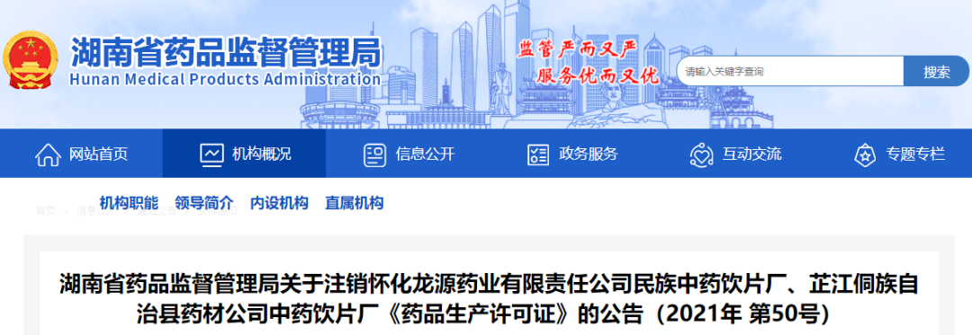 根据企业申请,按照《中华人民共和国行政许可法》《药品管理法实施条例》《药品生产监督管理办法》等相关法规规定,我局依法注销怀化龙源药业有限责任公司民族中药饮片厂《药品生产许可证》(编号:湘20160163)、《药品 GMP证书》(证书编号:HN20160194)和芷江侗族自治县药材公司中药饮片厂《药品生产许可证》(编号:湘20170207)、《药品GMP证书》(证书编号:HN20170260)。 自公告之日起,怀化龙源药业有限责任公司民族中药饮片厂和芷江侗族自治县药材公司中药饮片厂不得从事任何形式的药品生产、经营活动。 特此公告。 039家注销名单
