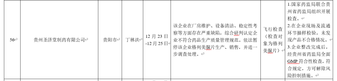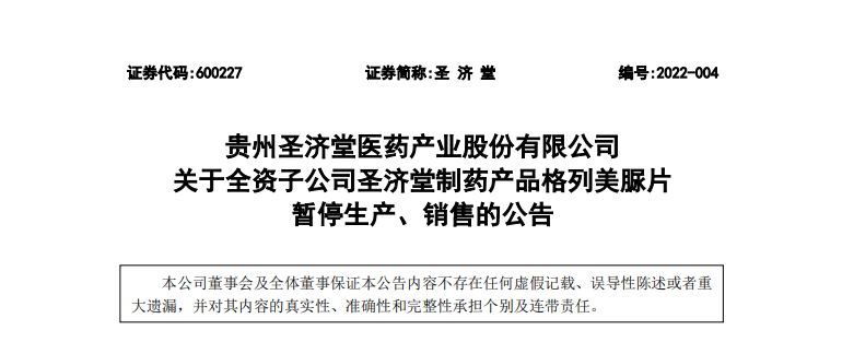 圣济堂医药全资子公司贵州圣济堂制药有限公司因飞行检查(集采品种格列美脲片专项检查)发现存在严重缺陷2项,主要缺陷2项,一般缺陷8项。 企业生产质量管理不符合《药品生产质量管理规范》要求,企业已被通知立即暂停格列美脈片的生产和销售。