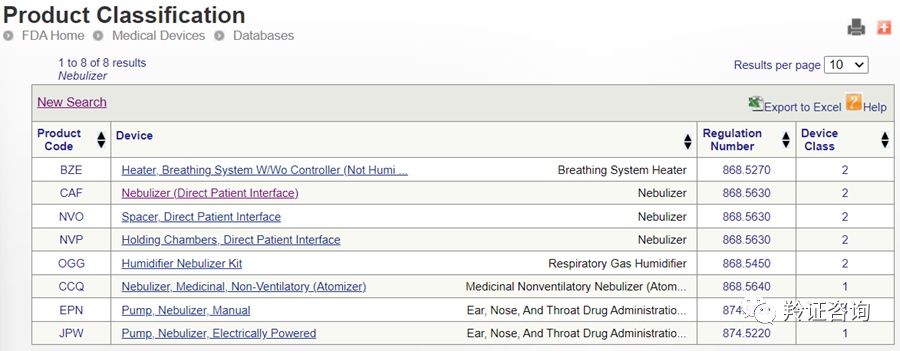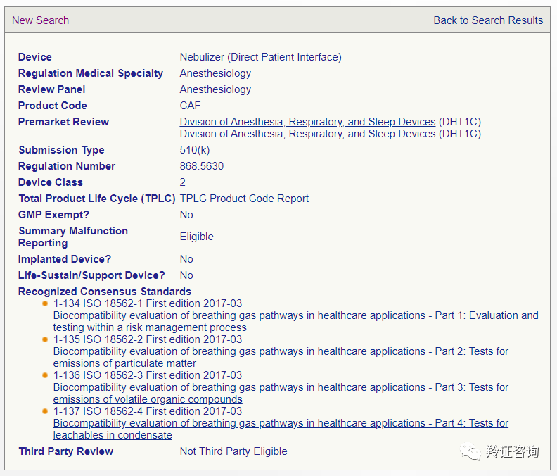 1. 产品分类查询 在此链接下,你可以查找产品代码,产品名称,产品分类,法规编码,递交方式,以及可以审核该产品的第三方机构。 以雾化器为例,在该页面的Device处输入雾化器英文名Nebulizer,即可得到8个相关结果,查看介绍选择与产品最匹配的Product code。 如选择CAF代码,我们可以得知该产品属于2类,需要递交510(k),需要符合的共识标准可能包括ISO 18562系列,没有可以审核的第三方机构(即只能递交FDA审核)。
