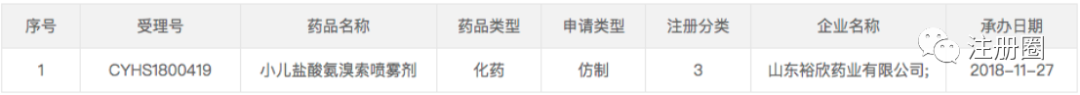 小儿盐酸氨溴索喷雾剂: 此处应为盐酸氨溴索喷雾剂,山东裕欣药业最早曾在2014以老化药3.3类(改变给药途径并已在国外上市销售的制剂)进行申报临床。并且其BE的参照药物为原研盐酸氨溴索口服液(沐舒坦),而非盐酸氨溴索喷雾剂的国外原研。