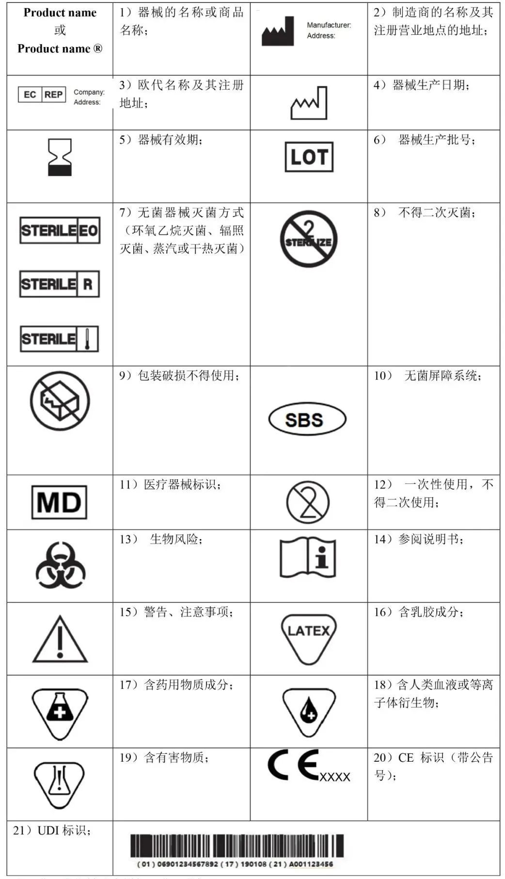(a) 器械的名称或商品名称; (b) 使用者识别器械所必需的详细信息、包装内容以及对于使用者不明显的器械预期用途; (c) 制造商的名称、注册商号或注册商标及其注册营业地点的地址; (d) 授权代表的姓名和授权代表的注册营业地点地址(若制造商在欧盟以外有其注册营业地点); (e) 若没有指明可安全使用的日期,则指明制造日期。若日期清晰可辨,制造日期可作为批号或序列号的一部分。 (f) 指明适用的任何特殊储存和/或处理条件; (g) 若以无菌方式提供器械,还应指示其无菌状态和灭菌方法; (h) 需要立即引起器械使用者和任何其他人的注意、需要采取的警戒或预防措施。 (i) 若器械用于一次性使用,则相应指明。制造商的一次性使用指示应在整个欧盟内保持一致; (j) UDI 载体应添加在该器械标签和所有更大包装上; (k) 标签应明显、清晰和不可磨灭地添加在器械或其无菌包装上。考虑到器械性质,无法或不适合将标签添加到器械上时,应将 CE 标识添加在包装上。CE 标识也应加贴在有使用明和任何销售包装中; (l) 应采用器械上市国(同时也是成员国)指定的欧盟官方语言编写,也可以采用预销往国的当地语言; (m) 标签上所需的信息应在器械本身上提供。若不可行或不适当,则某些或所有信息可显示在各单元的包装上和/或多个器械的包装上。