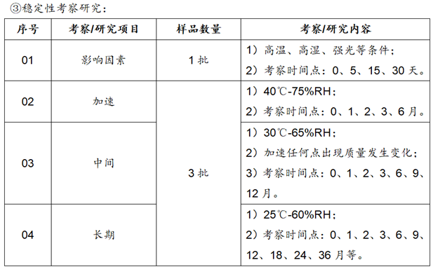 ②预影响因素/预加速对比试验:通过筛选确认2-3个工艺产品进行影响因素(高温、高湿、强光)/预加速(40℃-75%,1、2、3月)对比试验;选出合适工艺。