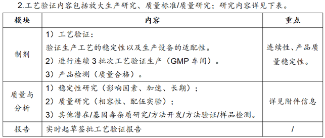 ①工艺验证:按照批准生效的工艺规程进行工艺验证生产3批,验证包括生产设备调试、技改后的工艺与质量稳定性,是否达到验证方案目标。②质量检测:质量评估报告并开具签批合格COA。
