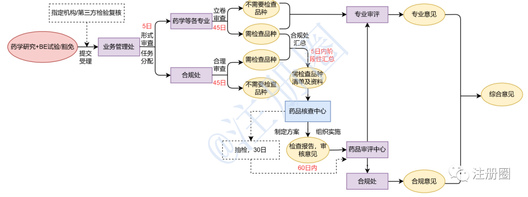 图2 仿制药一致性评价工作程序(基于审评、风险需要)2017 年8 月25 日,《总局关于仿制药质量和疗效一致性评价工作有关事项的公告》(2017年第100 号)发布,要求一致性评价申请受理后,药品审评中心于45日内对申报资料进行立卷审查,并根据立卷审查和风险评估情况提出有因检查和抽检的需求;药品审评中心设立合规办公室,协调有因检查、抽检以及审评等相关环节;核查中心组织对研制现场、生产现场或临床试验数据的有因检查或抽样。