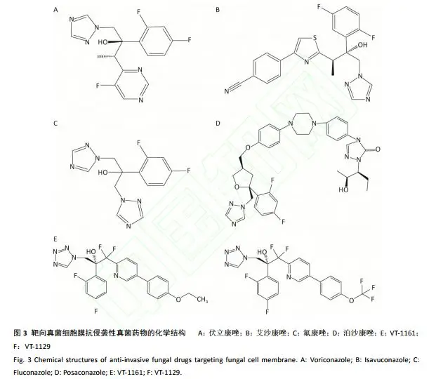 真菌细胞膜主要由磷脂类、鞘脂类和固醇组成,为各种功能蛋白提供基质结构,其主要的固醇成分为麦角甾醇,而人细胞膜主要为胆固醇(Sant et al. 2016)。真菌羊毛甾醇-14α-脱甲基酶(CYP51)可催化真菌细胞膜中的羊毛甾醇转化为麦角甾醇,传统唑类药物通过抑制ERG11 基因编码的 CYP51,抑制麦角甾醇的合成,并使毒性的甾醇产物在真菌细胞中积累,从而抑制真菌的生长与复制(Campoy & Adrio 2017)。然而,传统唑类药物含有结合的咪唑或三唑结构(图3A–3D),存在抑制人体中 CYP51 同源酶体的副作用。为解决上述问题,Viamet Pharmaceuticals公司正在开发几种 CYP51 的金属酶抑制剂,包括含有四唑结构的 VT-1161 和 VT-1129(图 3E,3F),其 具 有 改 善 的 靶 向 选 择 性 ( Hoekstra et al.2014),不会与人类 CYP51 结合(Warrilow et al.2014;Warrilow et al. 2016)。 2.1.1 VT-1161:VT-1161 比其他氮唑类药物对真菌的 CYP51表现出更高的选择性,其中对白念珠菌 CYP51 的亲和力为 Kd≤39nmol/ L,超过了对人体中同源酶体的 2 000 倍以上(Warrilow et al.2014)。该药物体内外对白念珠菌(白念珠菌的MIC 为 0.002μg/mL)、光滑念珠菌和近平滑念珠菌甚至对于抗氟康唑或棘白菌素的分离株均有活性(耐氟康唑菌株的MIC90为 0.12μg/mL),还可有效作用于小鼠的球孢子菌病(球孢子菌的MIC90为2μg/mL)(Warrilow et al. 2014;Garvey etal. 2015)。小鼠体内药动学实验结果显示,VT-1161具有口服生物利用度高(73%)、分布体积广(1.4L/kg)、半衰期长(>48h)等特点(Garveyet al. 2015)。一项评估了 VT-1161 相较于氟康唑治疗中重度急性 VVC 患者的疗效和安全性的 IIa期临床研究结果显示,VT-1161 的临床治愈率与氟康唑相似并具有更高的真菌学治愈率(93% vs.73%),随访期间复发率更低,且在该试验中被确定为安全且耐受良好(Brand et al. 2015)。 2.1.2 VT-1129:VT-1129 主要表现出对隐球菌的抑制作用(新生隐球菌的 MIC90为 0.06μg/mL、格特隐球菌的 MIC90为 0.25μg/mL)(Gray et al.2012),对耐氟康唑的新生隐球菌也具有一定的抑制作用(MIC90 为 2μg/mL)(Nielsen et al.2017)。文献报道,VT-1129 对隐球菌的 CYP51具有选择性抑制作用及强亲和力(IC50 范围为0.14–0.2μmol/L,Kd 为 14–25nmol/L),对人体中CYP51 及同源酶体的抑制作用和亲和力较弱(IC50约为 600μmol/L,Kd 为 4.53μmol/L)(Warrilow et al.2016)。此外,VT-1129 在隐球菌性脑膜炎小鼠模型中显示出改善的功效,在鞘内感染的免疫活性小鼠脑中检测不到隐球菌菌落,并且与氟康唑组相比增加了 30d 的存活率(Gonzalez-Lara et al.2017),在系统性念珠菌病小鼠模型中也显示出强效(Hoekstra et al. 2014)。VT-1129 被 FDA 认定为一种合格的抗感染疾病的产品,用于治疗隐孢子虫性脑膜炎,目前正在美国的健康志愿者中进行 I 期临床试验(Gonzalez-Lara et al. 2017)。