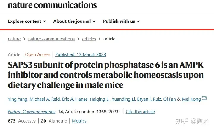 高脂饮食会增加代谢紊乱的风险,但其背后的机制尚未被完全解析。近日,加州大学欧文分校的研究人员就如何抵御高脂饮食造成的影响进行了研究,相关结果已发表于 Nature Communications。 这项研究集中在一种重要的代谢调节因子——AMPK上(5' AMP-activated protein kinase)。AMPK在细胞内能量代谢中发挥着关键作用,可以调节葡萄糖和脂肪酸的代谢、合成和分解等过程。此外,AMPK还可以影响细胞增殖、自噬和炎症等生物学过程。  摄入大量脂肪会导致AMPK活性降低,导致新陈代谢失去平衡,但AMPK活性降低背后的机制目前仍不清楚。SAPS3是AMPK的负调节因子,在高脂饮食下被诱导表达,研究认为这和AMPK的调控有关,因此,研究人员从一组小鼠的基因组中删除了SAPS3,并给小鼠进行高脂饮食,发现删除SAPS3的小鼠仍能保持正常体重,避免肥胖和糖尿病。 简单来说,SAPS3是AMPK的负调节因子,在高脂饮食下被诱导表达,从而抑制AMPK控制的代谢途径。删除SAPS3可以保护小鼠免受高脂饮食引起的不良后果,并逆转高脂饮食引起的代谢和转录改变。此外,该研究还发现AMPK基因的遗传抑制足以阻止SAPS3敲除小鼠在高脂饮食下出现保护性表型。这些结果揭示了SAPS3在代谢稳态中的负调节作用,并为治疗代谢综合征等相关疾病提供了新思路和策略。 可能在不久的后就有一种药物,可以让我们大胆享受各种美食,还怎么吃都不会变胖,让我们一期期待后续的进展吧~ 关注知乎、公众号:陶术生物 第一时间掌握科学资讯~ 原文链接: Ying Yang et al, SAPS3 subunit of protein phosphatase 6 is an AMPK inhibitor and controls metabolic homeostasis upon dietary challenge in male mice, Nature Communications (2023). DOI: 10.1038/s41467-023-36809-1