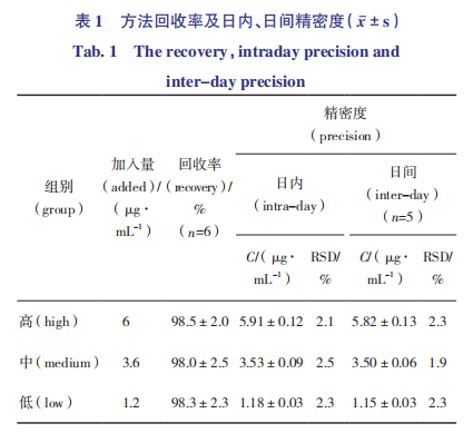 2.7 回收率与精密度取“2.3”项下高、中、低质控品,每个浓度设置6组平行,按“2.4”项方法进行处理并测定,同日进样, 计算回收率和日内精密度;每个浓度每天设置5个平行测定,取平均值,连续测定5d,考察方法日间精密度,结果见表1。