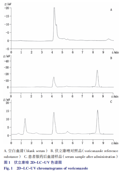 3 讨论 本研究所用全自动二维液相色谱系统与常规二维液相色谱不同[10-15],该二维液相色谱运用自动化的中间柱作为转移接口,中间色谱柱不仅承担了捕获与转移功能,还承担拦截功能,使目标物从共洗脱物中得以分离;在该二维液相色谱柱体系中,中间柱的特异性拦截和透过性能,可以实现多种化学结构不同的药物共柱体系测定。日常工作中,每日随机抽取1份质控品与样品随行检测,一旦发生质控偏离情况,可通过检查 LC2 条件对照品色谱图,校验 LC1 窗口状态以及观察中间柱的捕获、洗脱效果等一系列措施进行失控回溯,这是目前其他二维液相色谱无法比拟的,在长期的质量控制及运行过程中具有非常重要的意义。与其他二维液相色谱系统相比,该系统具有明显优势,样品前处理简单易行;样品测定完成后色谱柱无需清洗;流动相由于事先进行了灭菌和密封处理,可以长期放置,无需每日配置;系统采用热量智能补充技术,色谱柱通常15 min可以平衡完毕。这些技术大大节省仪器准备和维护时间,增加 TDM 的实时性能力。 方法学验证结果显示,回收率>95%。在0.38~12μg·mL-1内,具有良好的线性关系(r=0.999 9),精密度及稳定性试验均符合要求。280例临床血样监测结果,278例均在标准曲线范围内,仅有2例低0.38μg·mL-1,查明原因,为患者忘记服药所致。本研究建立的全自动二维液相色谱测定伏立康唑血药浓度的方法,具有前处理简单,测定快速,灵敏度高,准确性好,稳定性强等特点,能满足临床报告及时性、准确性和测定范围等要求,可以作为临床治疗药物浓度监测的有效方法。