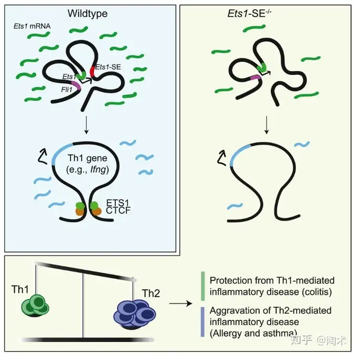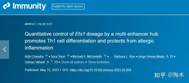 而多增强子中心(增强子是能够增加启动子活性从而增加基因转录频率的DNA序列)可通过控制ETS1基因的多个增强子之间的相互作用,调节ETS1表达的水平。 总之,研究发现,Ets1基因的表达水平对Th1细胞分化和过敏性炎症的发生有重要影响。通过对Ets1基因的多个增强子区域进行研究,作者发现这些增强子区域可以形成一个多增强子中心,对Ets1基因的表达进行调控,从而影响Th1细胞分化和过敏性炎症的发生。 研究还发现,多增强子中心的形成和Ets1基因的表达水平之间存在一定的剂量效应关系,即多增强子中心的形成可以精细调节Ets1基因的表达水平,从而影响Th1细胞分化和过敏性炎症的发生。这些研究结果为深入理解Th1细胞分化和过敏炎症的发生机制提供了新的思路和理论基础,或许在将来,我们可以不用担心对任何食物或花粉过敏,虽然这可能是一段很长的路程。 关注公众号、知乎、哔哩哔哩、视频号:陶术生物 第一时间获取科学前沿资讯~ 参考资料: Chandra, Aditi et al. “Quantitative control of Ets1 dosage by a multi-enhancer hub promotes Th1 cell differentiation and protects from allergic inflammation.” Immunity, S1074-7613(23)00221-2. 31 May. 2023, doi:10.1016/j.immuni.2023.05.004