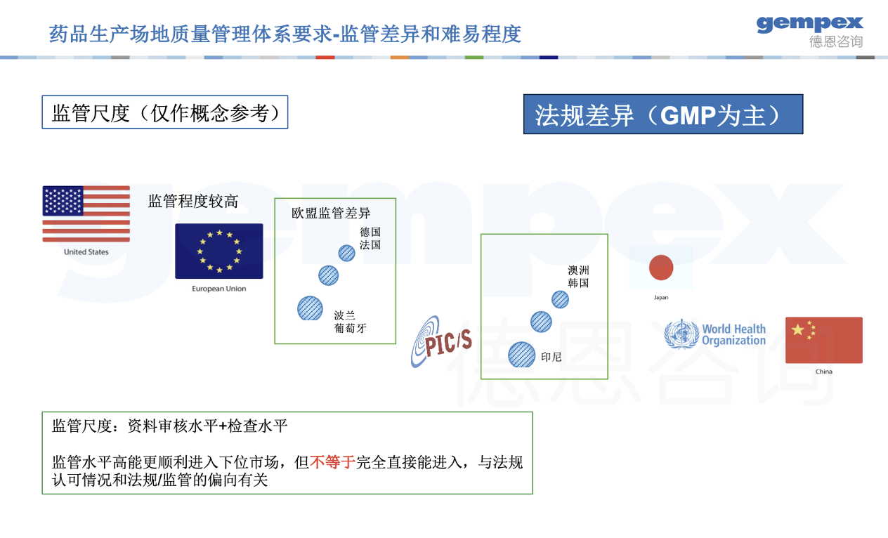 a) 监管差异大 符合当地要求,首先意味着需提交完整的注册资料,并通过监管部门的审批,包括相关场地的合规检查。这一切都与该国监管机构的风格和水平密切相关。图1概念上展示全球主要市场监管的普遍水平和理念差异,建议企业提前借助专业咨询机构开展差距分析,明确自身与目标市场的合规距离。