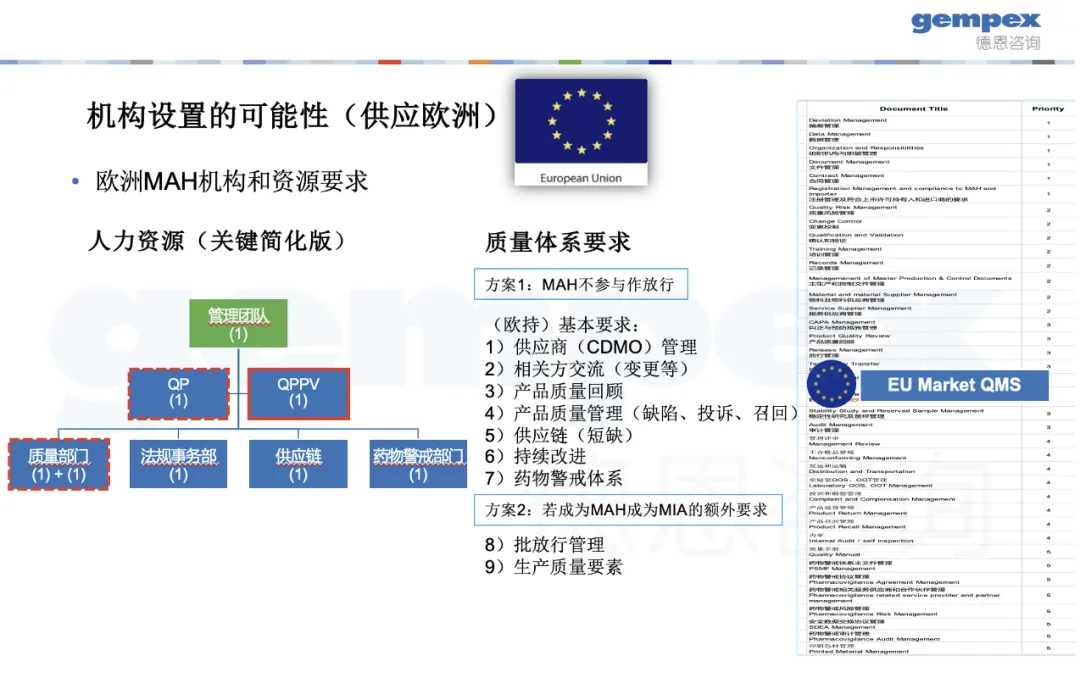 根据营商模式和责任要求,企业还需建立相应的人力资源架构和质量管理体系,以满足运营和监管部门的要求。下图4以欧洲设置MAH机构为例,展示了其基本架构与职能分工,为企业自建或筛选合作伙伴提供参考。 图4 欧洲MAH机构和资源要求