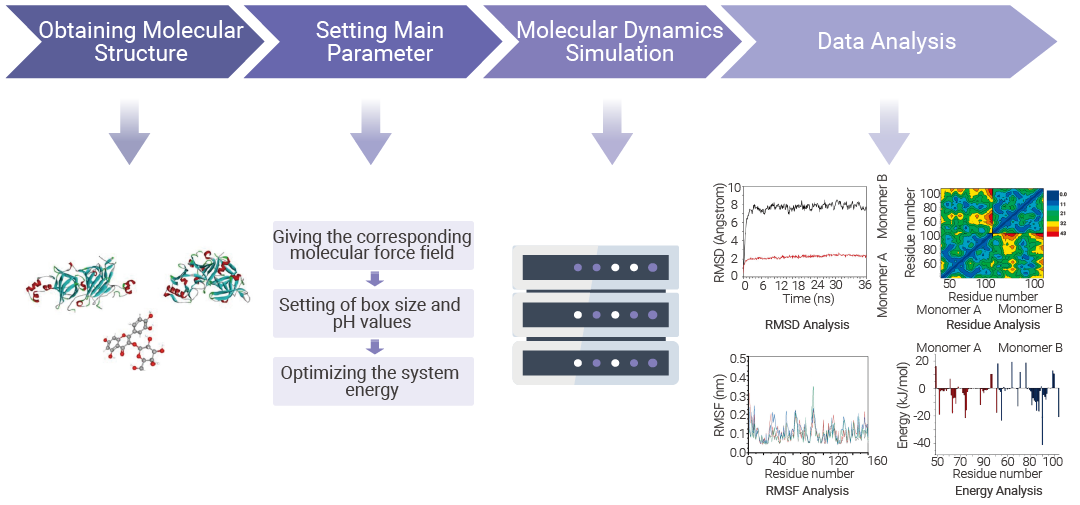分子动力学 (Molecular Dynamics, MD) 模拟是一种基于牛顿力学,综合了物理、数学和化学等多种学科的计算机模拟方法,可以依据当前分子体系的位置、速度和动能等信息,推测该体系未来的位置、速度和动能,从而揭示分子运动的客观规律。 通过计算机分子模拟,研究人员能够在分子水平上理解生物大分子的运动与生物功能、蛋白- 小分子之间相互作用机理。通过对复合物稳定性分析 (RMSD、RMSF)、氢键分析、关键氨基酸能量贡献以及结合自由能计算,可以实现体系静态对接到动态验证的升级,让结论更扎实、更有说服力。