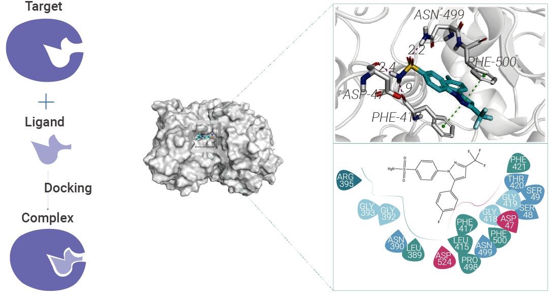 图 3. 蛋白-小分子的分子对接与结合模式分析。