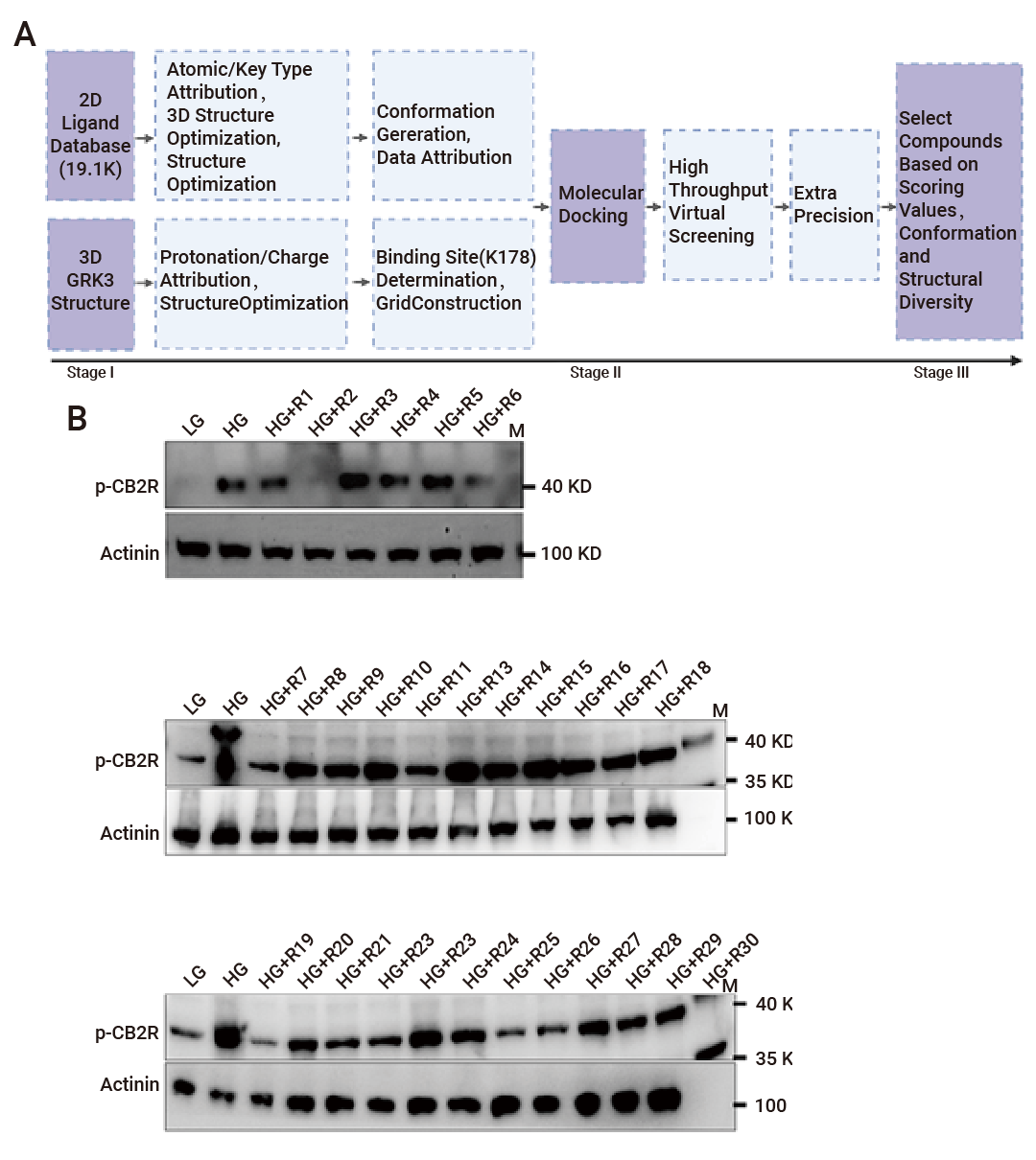 在本案例中,作者先证实 GRK3 通过磷酸化 CB2R (S335 位点)加速其降解,加剧心肌损伤,锁定 GRK3 为靶点。对 19100 种生物活性化合物高通量虚拟筛选;经分子对接、10ns 动力学模拟验证结合稳定性,筛选出异绿原酸 A (ICQA)。 SPR 证实其与 GRK3 高亲和力结合 (Kd=199nM),体内外实验确证 ICQA 可抑制 GRK3 活性,保护心肌功能,为糖尿病心脏损伤提供新疗法。